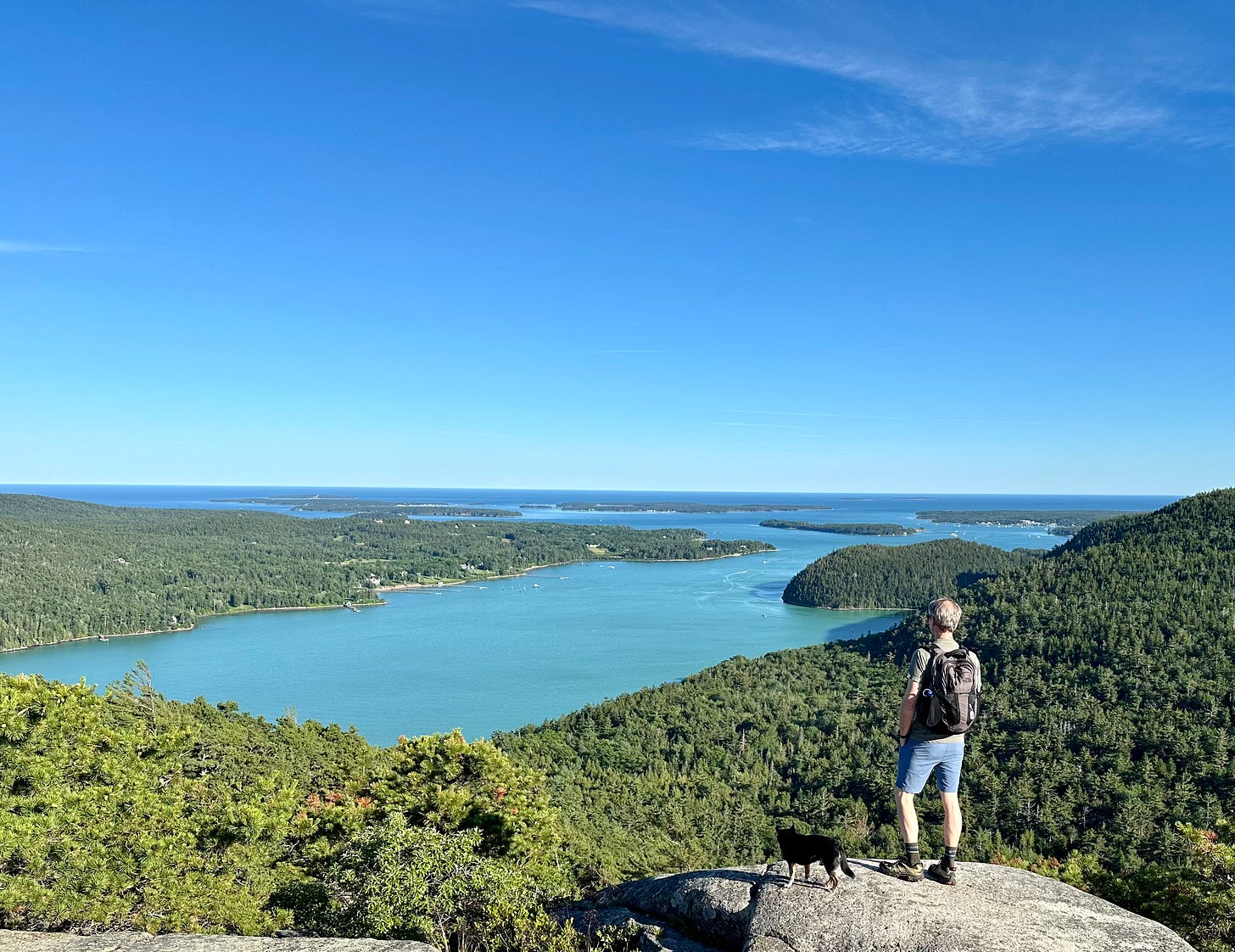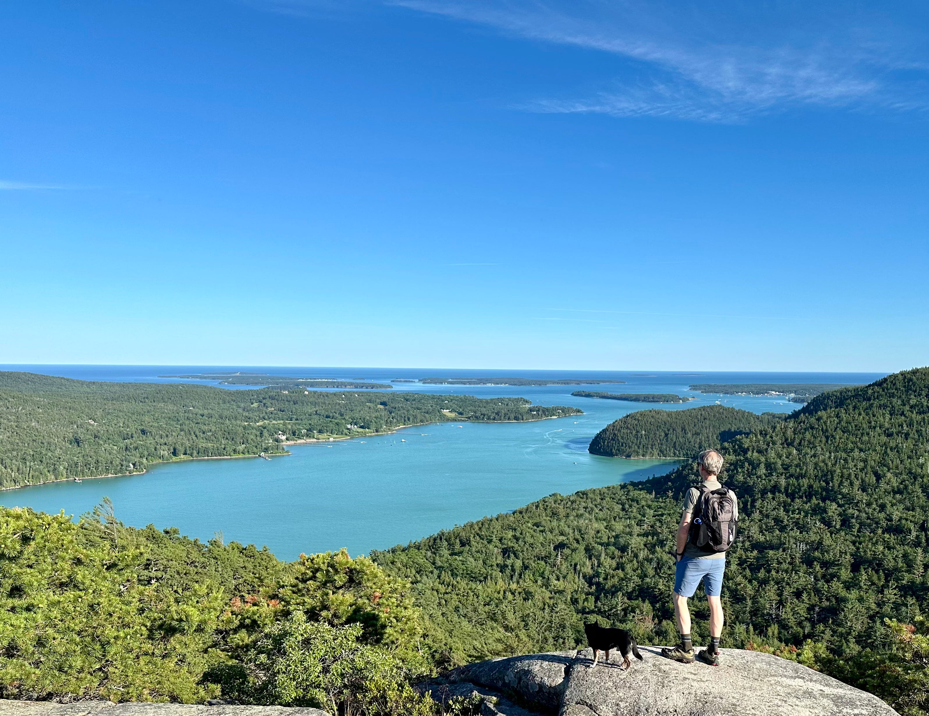 At the top? That’s where the view is. You can see Somes Sound to the south. That body of water divides Mount Desert Island into two sides. And then there is the Atlantic Ocean hosting the Cranberry Isles and more.