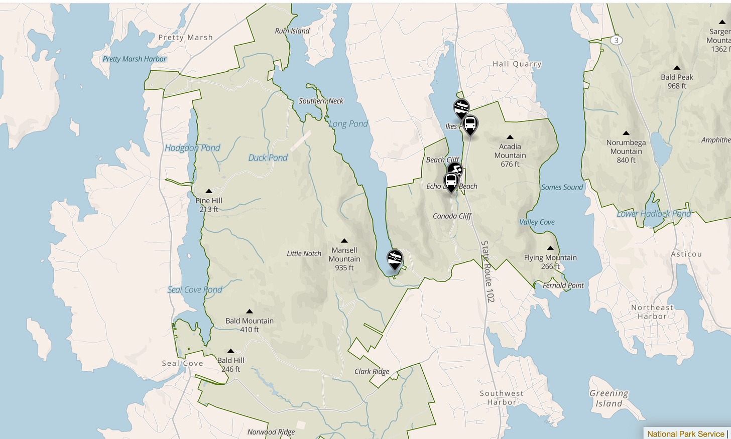 For Acadia Mountain, Ikes Point, and Echo Lake Beach, continue south on Maine Route 102 towards Southwest Harbor. Look for parking area signs along the road.