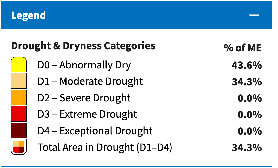 According to the U.S. Drought Monitor, the entire coast of Maine is in a moderate drought, which accounts for approximately one-third of the state.