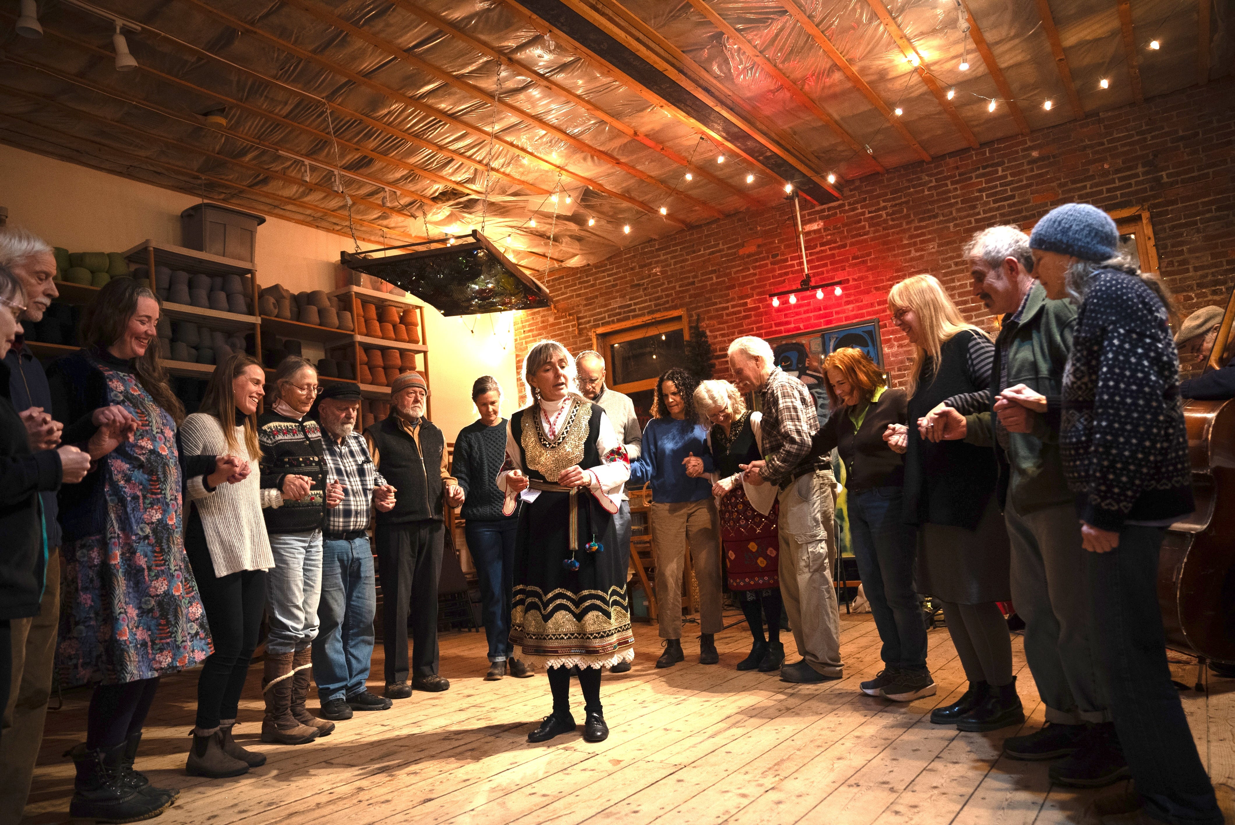 "In international folk dancing we mostly dance in a circle holding hands. These are generally village dances designed so that everyone in the village could do them. If new dancers are worried about learning the dances, they shouldn't be. The dances are easily learned just by watching the leader—often as simple as walking. We also explain the history of each dance we learn but it's not like a class—it's more like a party with a host getting those who want to dance up on the dance floor. But some folks come just to listen to the music and that's ok too!" Carolyn Rapkievian said.