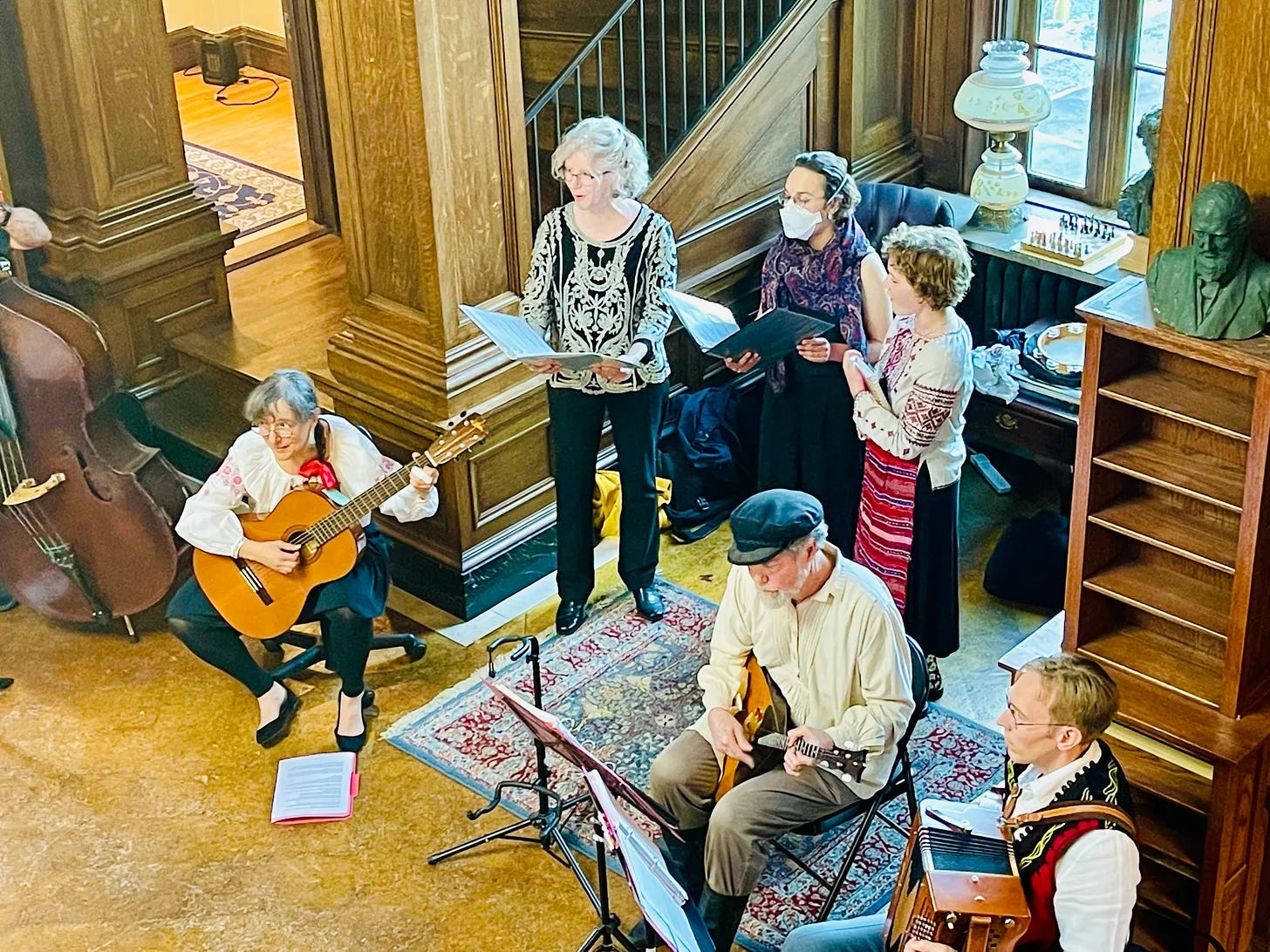 Anne Tatgenhorst heard about the band and brought two other Balkan singers with her to the group and the repertoire expanded to include Bulgarian songs. After the invasion of Ukraine, the band added Ukrainian songs, and at the invitation of the new annual Armenian Picnic in Searsport, the band learned Armenian songs and dances.