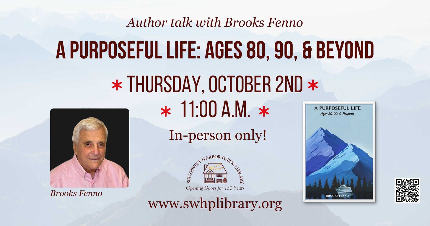 SOUTHWEST HARBOR—Join us on Thursday, October 2, from 11:00 a.m. - 12:00 p.m. at the Southwest Harbor Public Library to hear from nonagenarian Brooks Fenno speaking about his book A Purposeful Life: Ages 80, 90, and Beyond. Fenno will convey the observations of an individual who has recently navigated the seas of the 80s and is encamped on the shores of the 90s. The program is in-person with registration recommended.