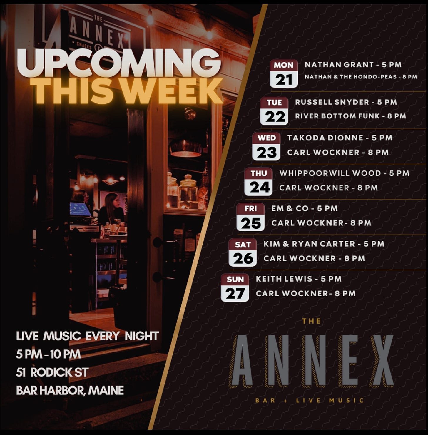 “ANNEX is amazing!” Wockner said. “I met the Bo Jennings (director of operations) many years ago performing in Nashville, Tennessee. This will be my third trip up to Bar Harbor to perform, and I particularly love Annex at Side Street as the more intimate setting really elevates the atmosphere of live music in a special way.”