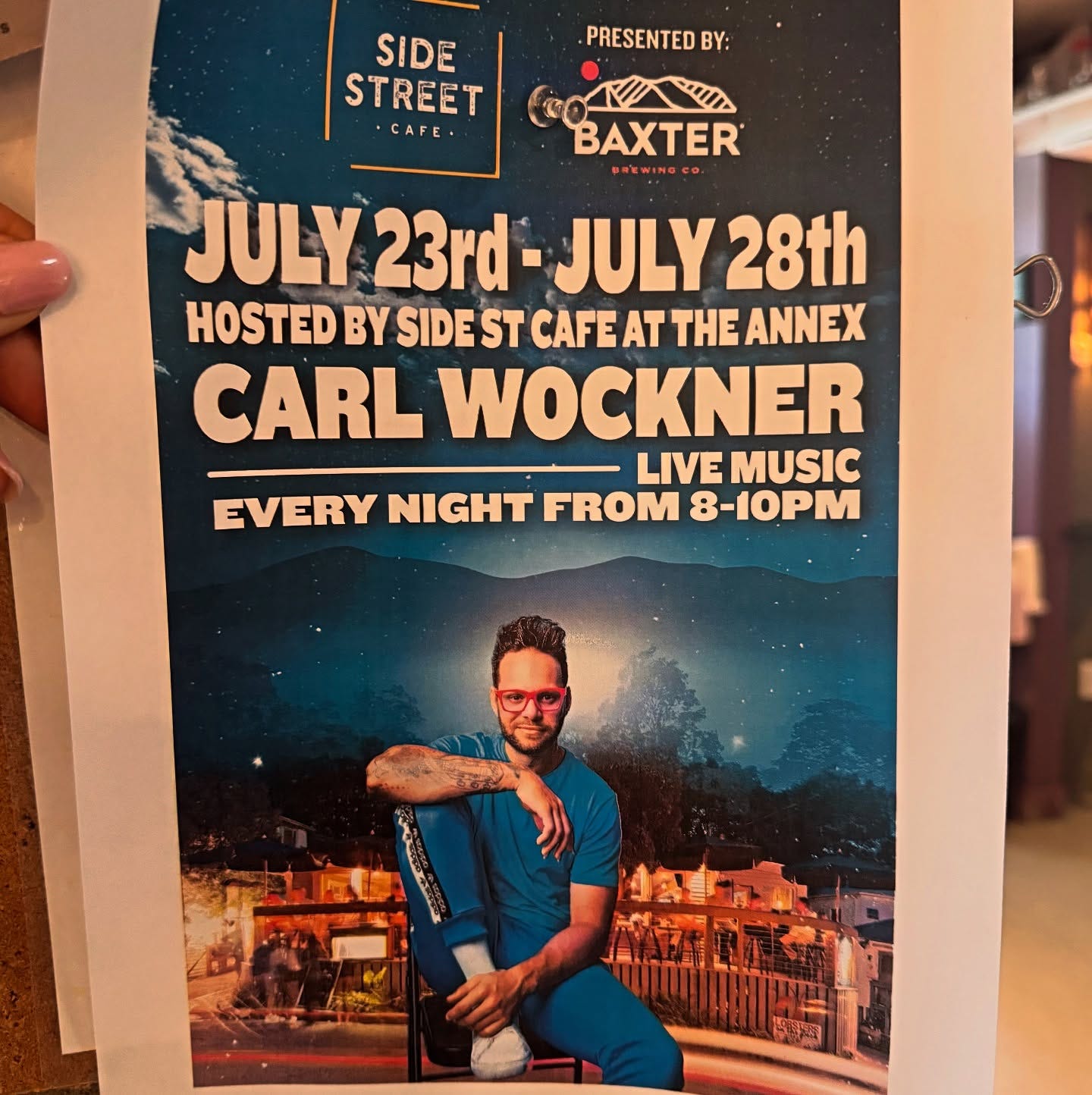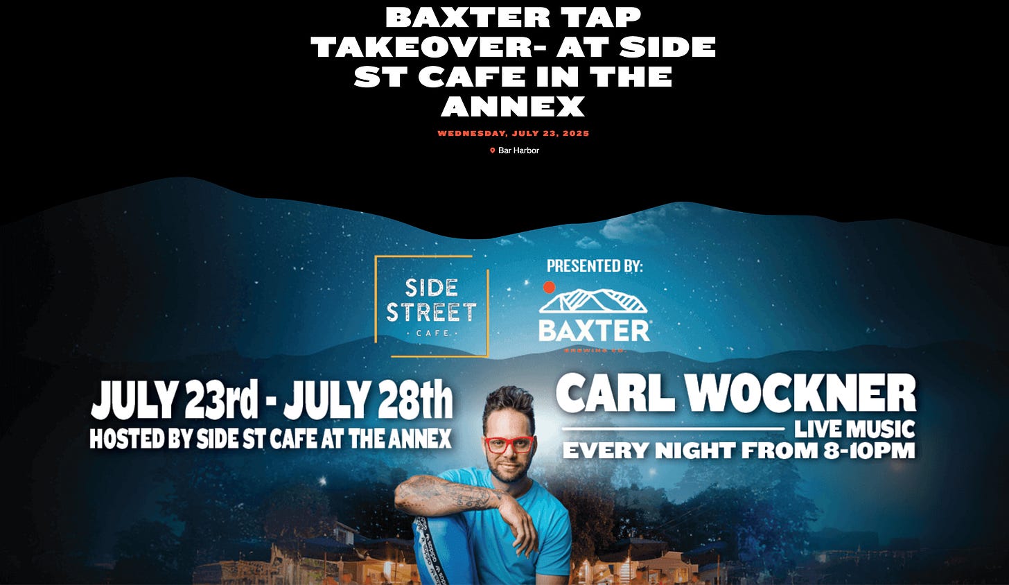“Baxter had been such a great supporter of live music, including last year’s (and this year’s) Music Harbor. They were my first call when looking for a sponsor to bring Carl to Bar Harbor again, and they jumped at the chance,” Jennings said. “We are grateful for their partnership, and look forward to the next five nights with Carl Wockner brought to you by Baxter Brewing!”