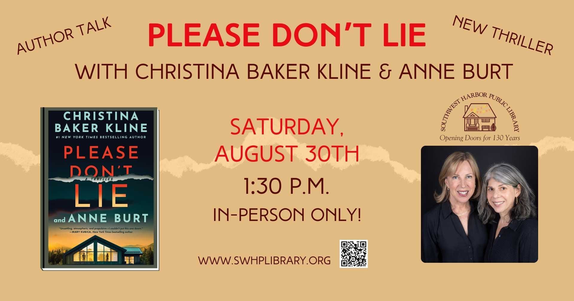 SOUTHWEST HARBOR—Bestselling author and Southwest Harbor summer resident Christina Baker Kline (Orphan Train, The Exiles) and acclaimed novelist Anne Burt (The Dig) join forces for a gripping new thriller, Please Don’t Lie (Thomas & Mercer; September 1, 2025). The Southwest Harbor Public Library will host both authors on Saturday, August 30, 1:30–2:30 p.m., for a conversation about their creative process, the making of Please Don’t Lie, and the experience of co-writing a high-stakes literary thriller. Books will be available for purchase and for signing.