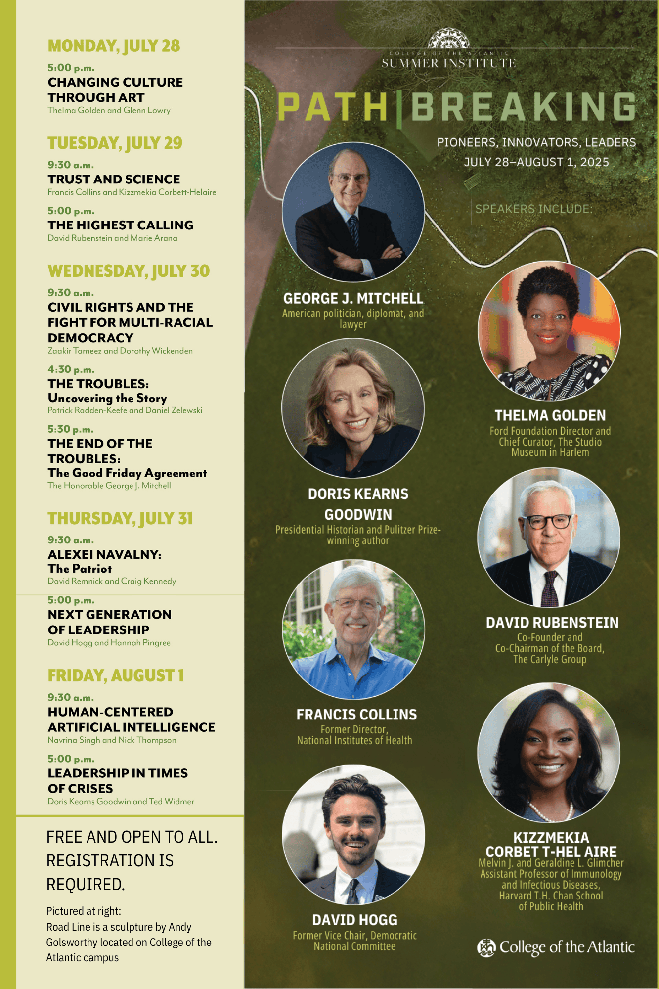 BAR HARBOR—The 2025 College of the Atlantic Summer Institute: Path Breaking will celebrate exceptional individuals whose work and beliefs have changed how we see the world. Brilliant, brave, defiant, the subjects of our sessions exemplify the power of commitment and the need to seek new solutions. Many of the figures we will hear from or about experienced great personal risk to their careers—some to their lives. They persisted. Their example serves as a reason to hope, a road map for change, a resetting of our moral compass.