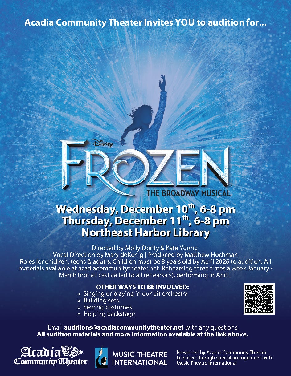 Auditions will be Wednesday, December 10 and Thursday, December 11 from 6-8 pm at the Northeast Harbor Library. There are roles for children, teens and adults; children must be 8 years old by April 2026 to audition. Audition materials can be found in advance on ACT’s website at acadiacommunitytheater.net and in this folder, https://drive.google.com/drive/folders/1byrjyrD6a9cqFeDD8aDli8qL7v7ozi8W?usp=sharing