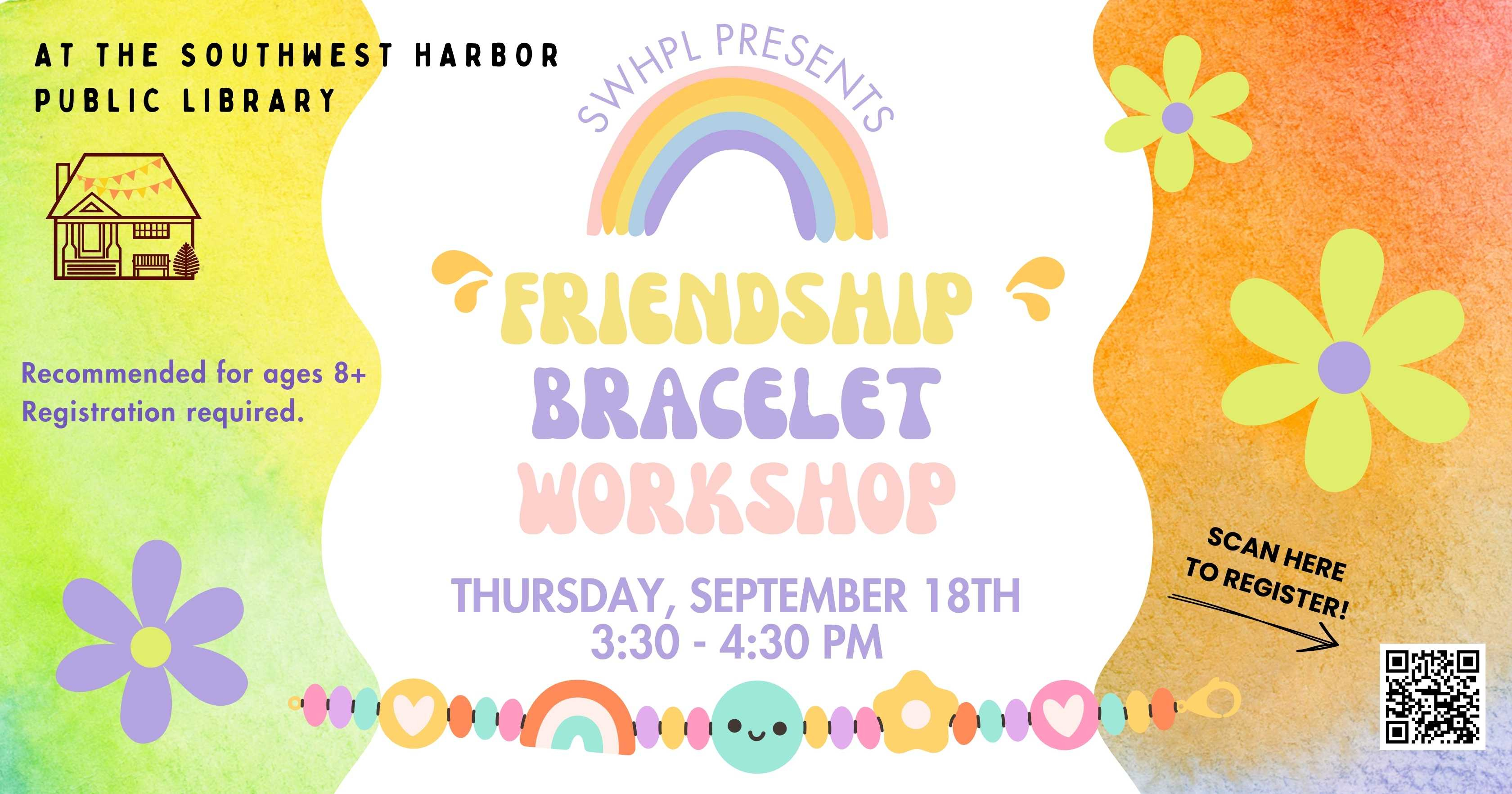 Friendship Bracelet Workshop: Tweens and teens are invited to come create fun, beaded jewelry at the library on Thursday, September 18th from 3:30 - 4:30 pm. All materials will be provided. This program is recommended for ages 8+, and registration is required. https://tinyurl.com/bp5zhrrw