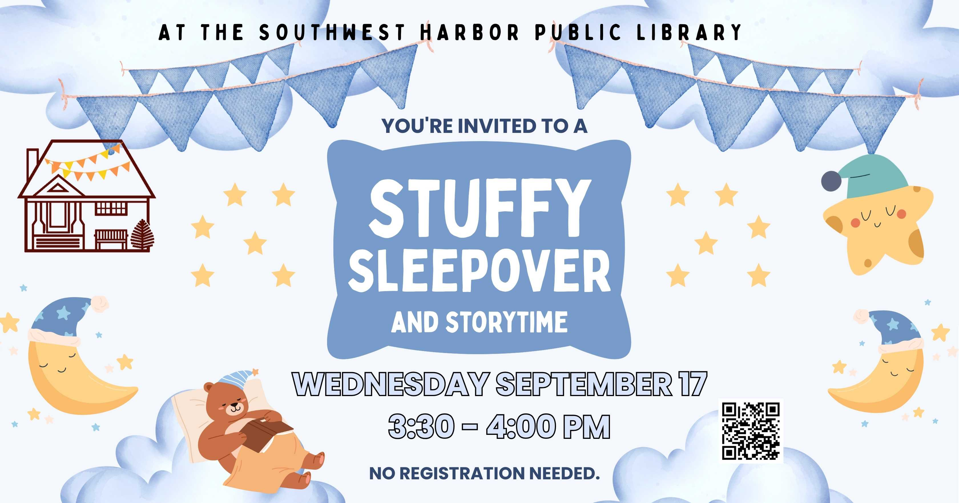 Stuffy Sleepover: Kids of all ages are invited to a special bedtime-themed storytime and stuffed animal sleepover, Wednesday, September 17th at 3:30-4:00 pm. We'll read a selection of bedtime books, then tuck the stuffies in for a night of fun at the library! Pick-up for stuffies will be the following day, September 18th, during open hours. No registration required. https://tinyurl.com/yjksx383