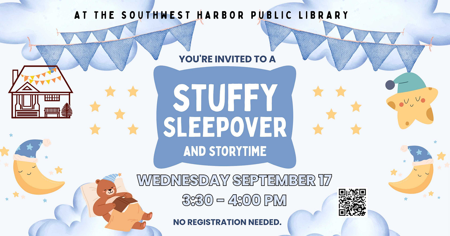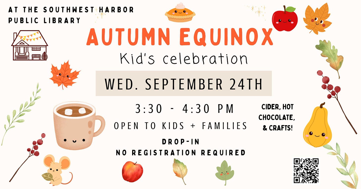 SOUTHWEST HARBOR—Join us at the Southwest Harbor Public Library for a variety of fun fall events for kids, including a Stuffy Sleepover with storytime, a Friendship Bracelet Workshop for tweens and teens, and an Autumn Equinox Celebration with crafts and seasonal treats. Events take place September 17th, 18th, and 24th, and are open to a range of ages, with some requiring registration.