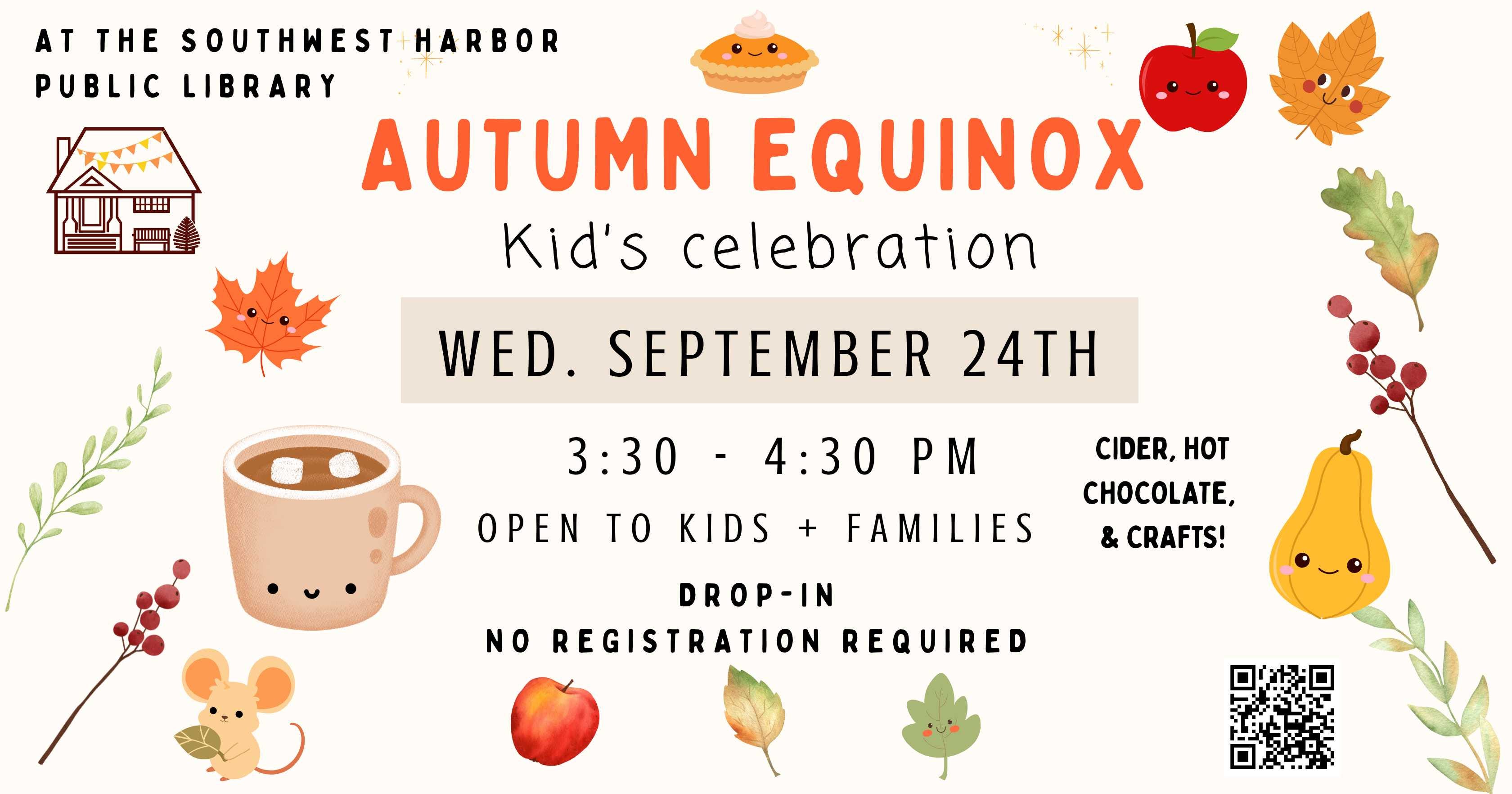 Autumn Equinox Celebration: Kids and families are invited to attend this celebration of the first day of fall! Come ring in the cool weather on Wednesday, September 24th from 3:30 - 4:30 p.m. with hot chocolate, apple cider, and fun, fall-themed crafts. Kids of all ages are welcome, and no registration is required. https://tinyurl.com/bp5zhrrw