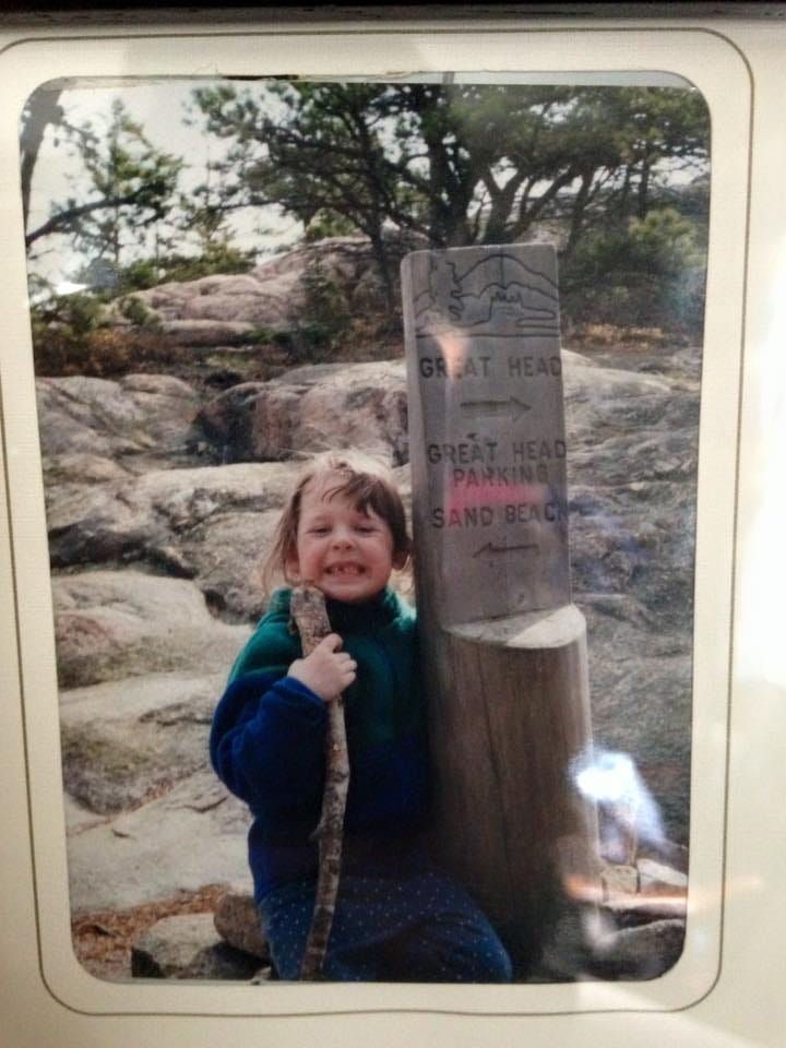 When my daughter Em was little we were waiting to pick up her Dad from the Jackson Lab where he worked. We had some extra time. So, I strapped her little two-year-old self onto my baby-backpack-type carrier and headed up Champlain Mountain on a trail full of switchbacks and open faces.