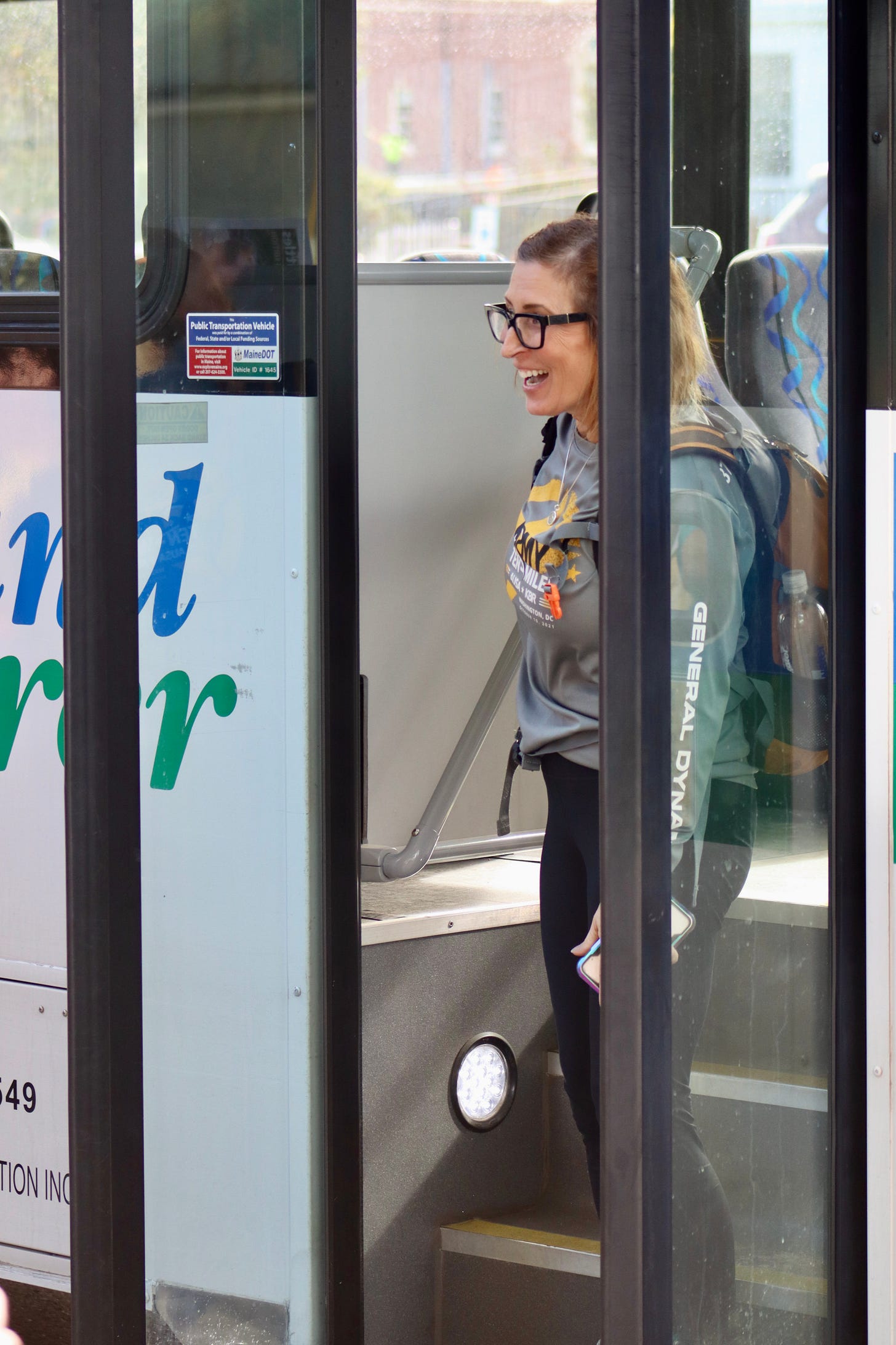 Beth Gearhart, visiting from Chambersburg, Pennsylvania, hopped on the bus at Sand Beach heading to Bar Harbor, and off the bus to applause and received flowers and presents from both Friends of Acadia and L.L.Bean, which is a significant financial supporter of the bus system, which turned 25 this year.