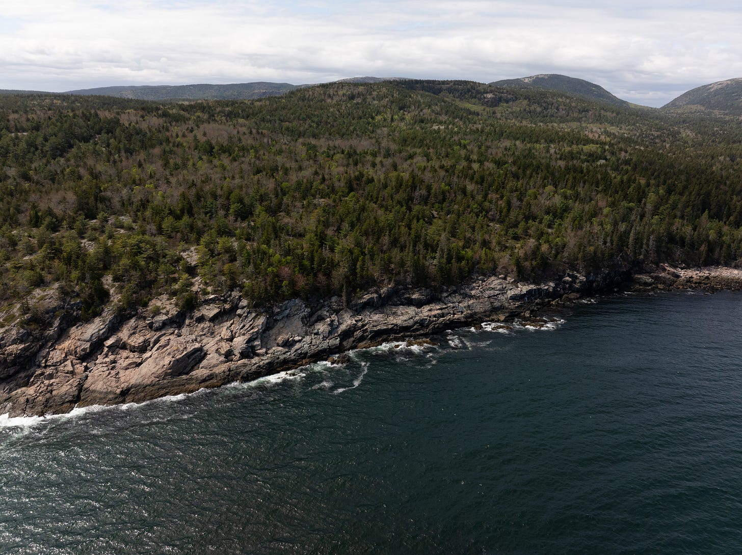 The property includes undeveloped forest, exposed granite ledges, and pocket wetlands that contribute to more than 22,000 acres of connected conservation land. The area features a perennial stream flowing to Hunters Brook and roughly 1,800 feet of bold granite cliffs along the western shore of Hunters Beach — a stunning stretch of coastline visible from popular overlooks within Acadia National Park and from the Park Loop Road.