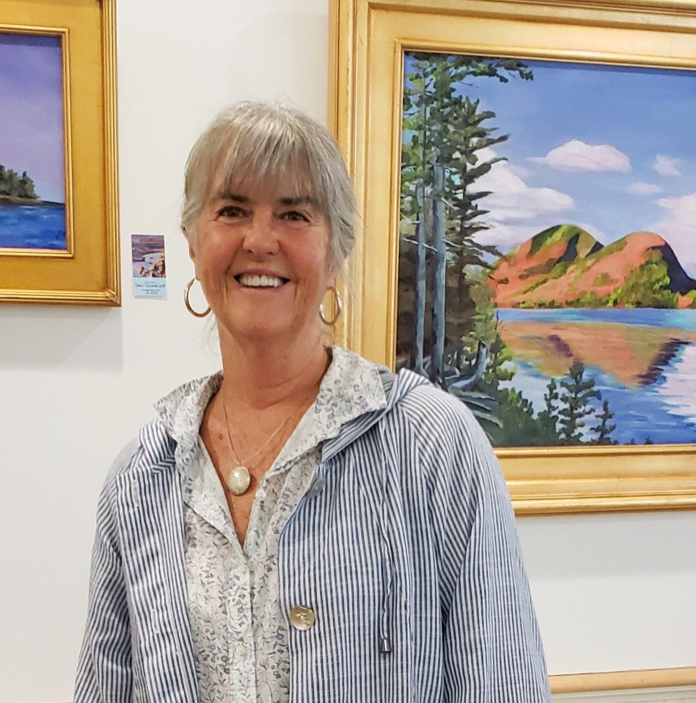 Vicky Smith, a primarily self-taught oil painter, began her art journey after raising her children. Inspired by local artists, she enjoys plein air painting and capturing new landscapes. Her work has been shown at numerous venues, including the Northeast Harbor Library, MDI Open, Artwaves, Smart Studio, Jesup Library, and currently at the Islesford Dock Gallery.