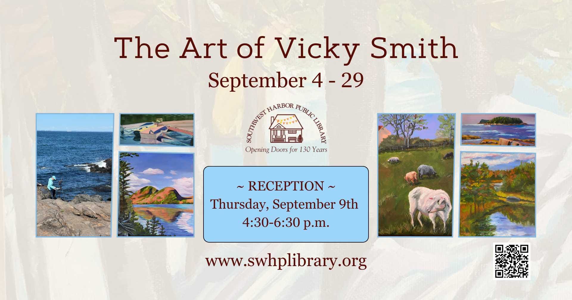 SOUTHWEST HARBOR—Stop by the Southwest Harbor Public Library from September 4 to 29 to view an exhibit of Vicky Smith’s plein air landscape oil paintings and a showcase of mixed media art by Juniper Witkowski featured in the Holmes Reading Room display case. All are welcome to an art reception for Vicky Smith on Tuesday, September 9, 5-7:30 p.m. Light refreshments to be served.