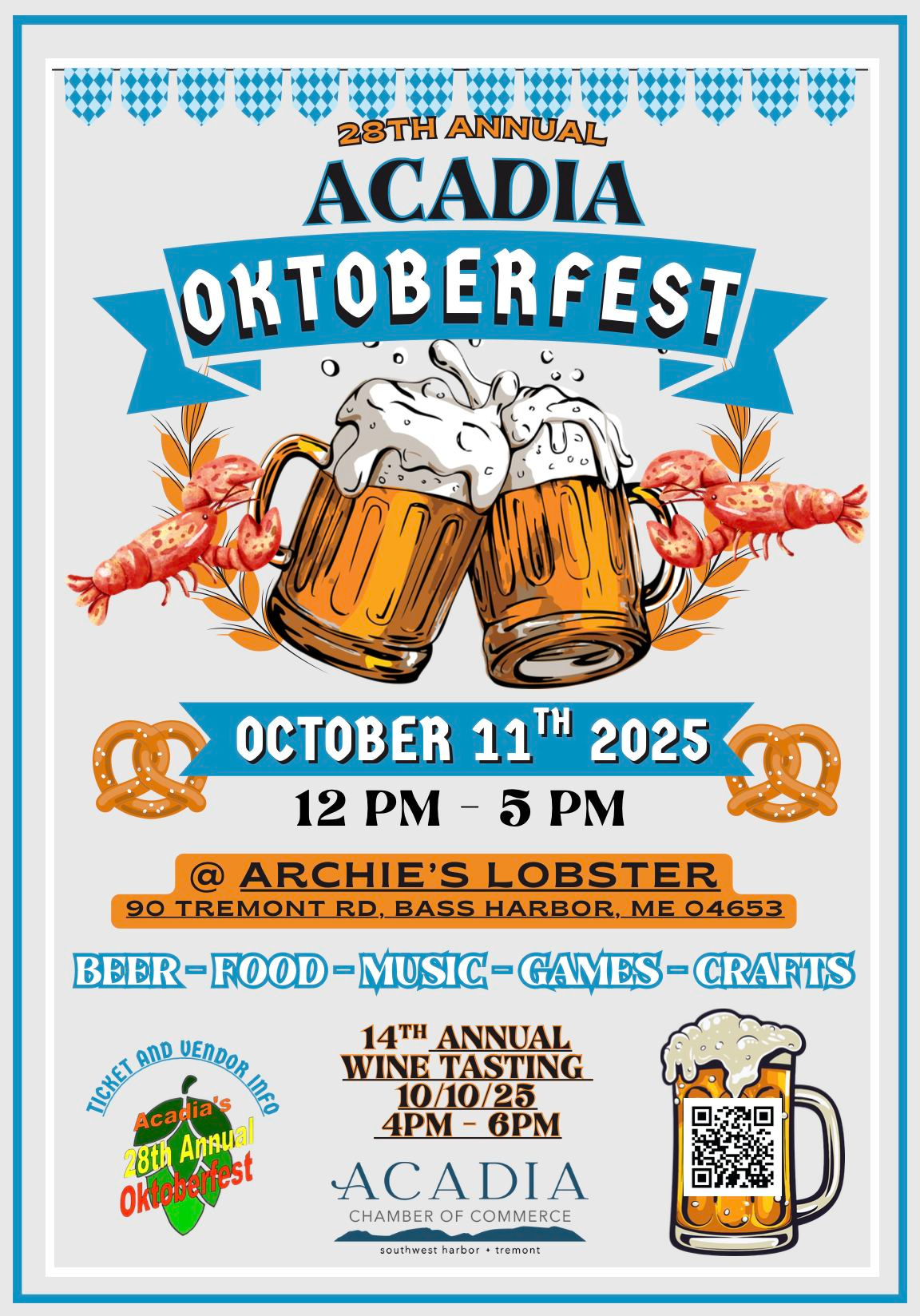The longest running Oktoberfest in Maine will be at Archie’s Lobster earlier in October. The 14th Annual Wine Tasting is October 10 from 4 p.m. to 6 p.m. The 28th Annual Brewfest is October 11 from noon to 5 p.m. at Archie’s Lobster, 90 Tremont Road, in Bass Harbor.