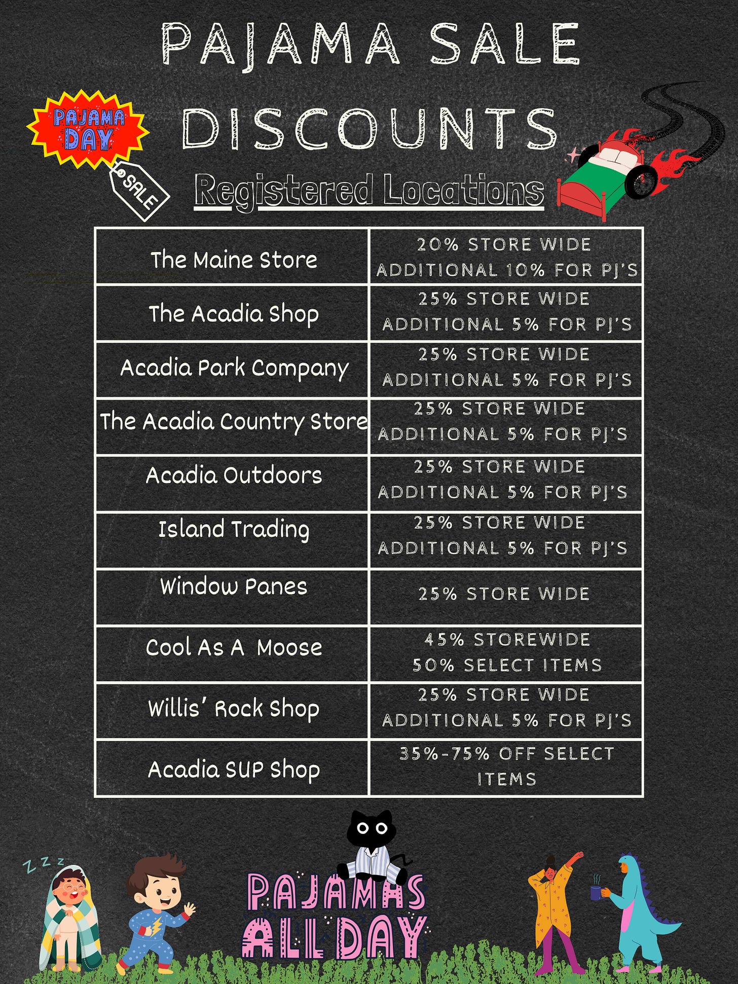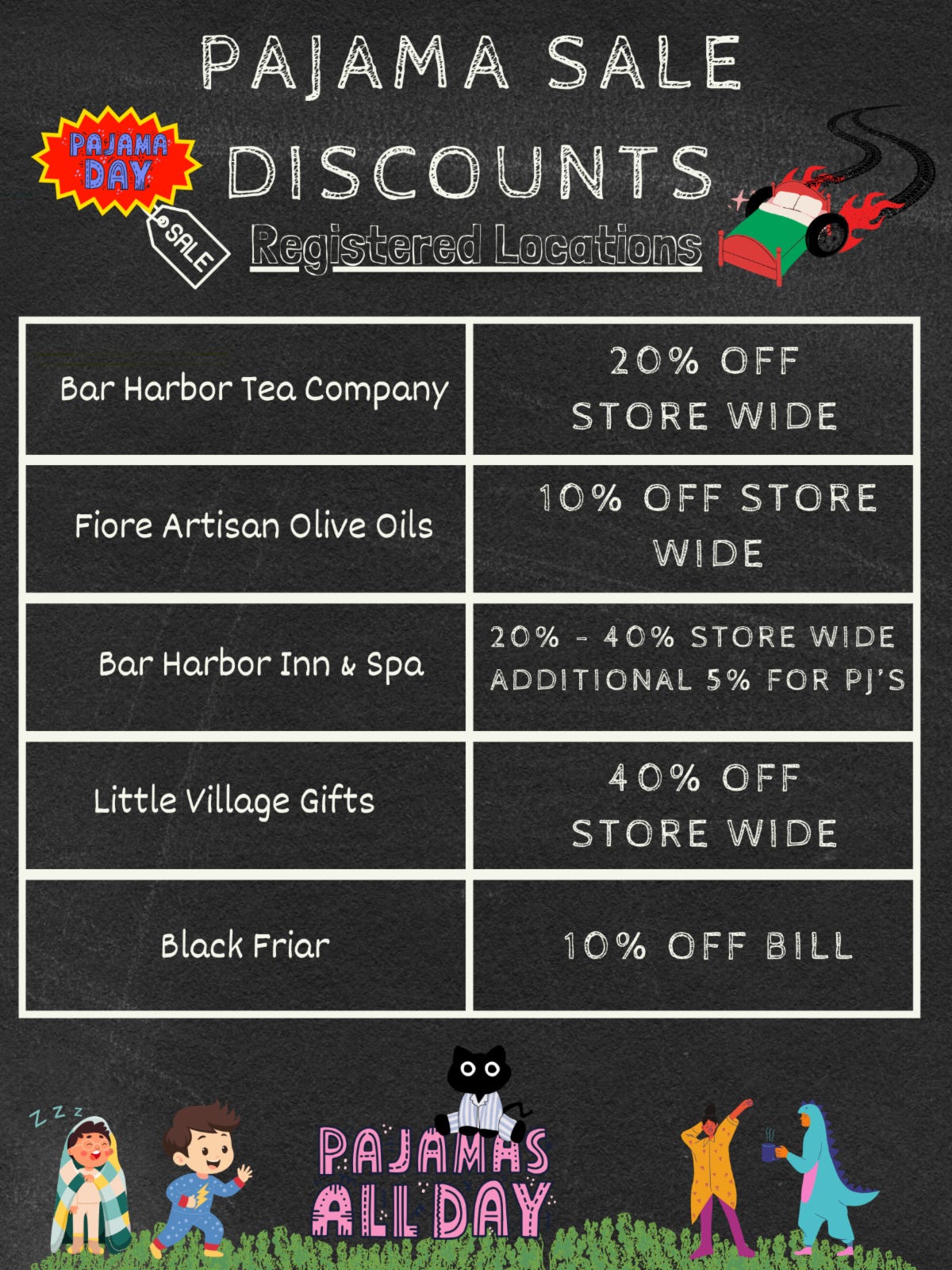 Local businesses participating are listed in the images below. Sponsors include First National Bank, the Bar Harbor Hospitality Group, and Cape Air.