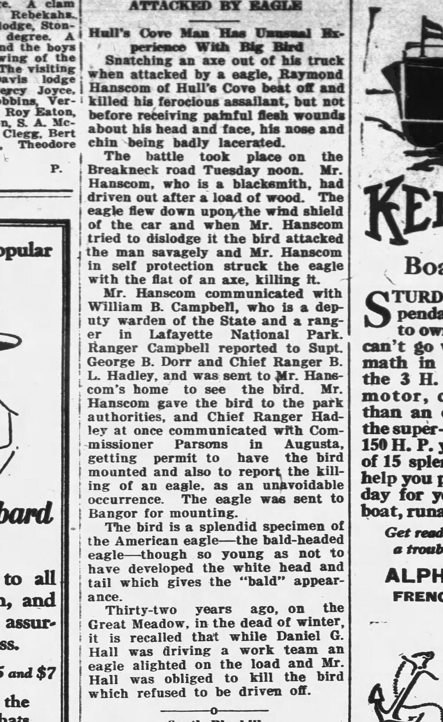 According to a 1928 copy of the Ellsworth American, a Hull’s Cove man, Raymon Hanscom, had to snatch an axe from a truck and beat off an eagle who was attacking him.